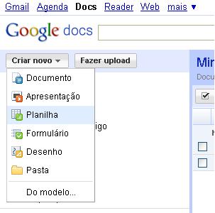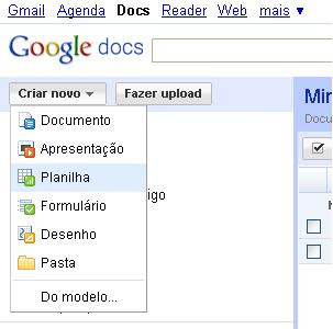 Primeiro você precisa ter uma Google Accounts e está inscrito no Google Docs feito isso, estando na página do Google Docs, va na opção Criar novo >> Planilha: