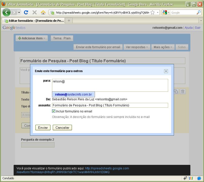Selecionando o botão Enviar este formulário por e-mail a tela a seguir aparece, onde se pode selecionar quais endereços de e-mail você deseja enviar o formulário: